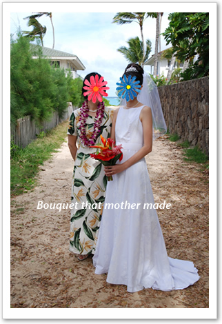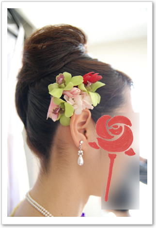 で、一旦ホテルにもどってお色直し。頭に花装着。これもがんばって母が・・